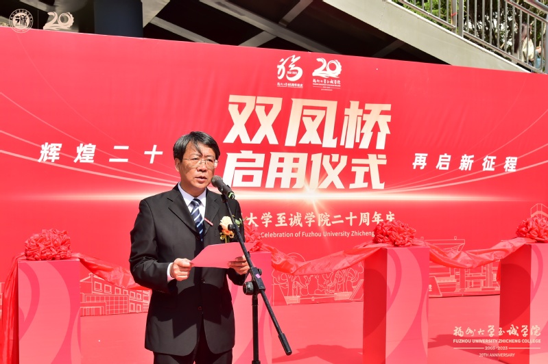 10月21日,在福州大学至诚学院20周年庆到来之际,怡山校区“双凤桥”正式启用。当天上午,举行了“双凤桥”启用暨命名揭牌仪式。福州大学党委书记陈国龙,福州大学党委副书记、至诚学院党委书记张星,福州大学党委常委、副校长夏帆,至诚学院党委常务副书记何希耕,至诚学院校友会顾问、原院长陈为旭等领导来宾出席仪式,学院师生代表近百人到场共同见证。