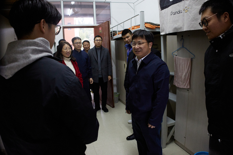 在至诚学院和化工学院院领导等陪同下,江莉龙副校长走访了学生宿舍、食堂、医务室等场所,实地了解校区建设发展情况,亲切慰问师生员工。