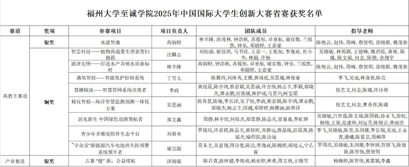 近日,福建省教育厅公布福建省大学生创新大赛(2025)获奖名单,福州大学至诚学院参赛团队凭借前瞻性创新思维、扎实的专业技术储备及高效的项目落地能力,在赛事中斩获佳绩,共获得省级奖项10项,其中高教主赛道银奖1项、铜奖8项,产业赛道银奖1项,充分彰显了学院在创新创业人才培养领域的突出成效。