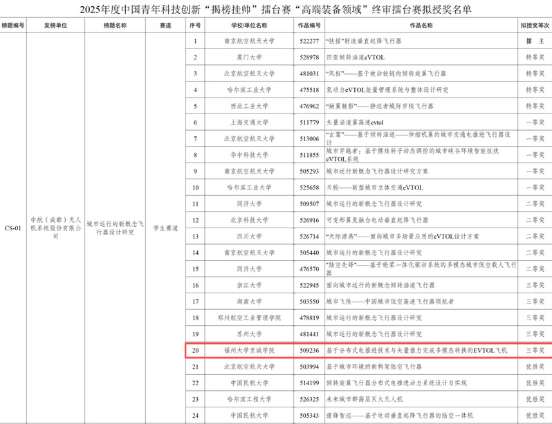 近日,第十九届“挑战杯”竞赛2025年度中国青年科技创新“揭榜挂帅”擂台赛高端装备领域主擂台赛在湖南省长沙市举行。福州大学至诚学院机械工程系学生团队提出的“基于非对称分布式电推进的多模态eVTOL”设计方案在竞争激烈的“城市低空飞行器”榜单中脱颖而出,荣获全国三等奖。