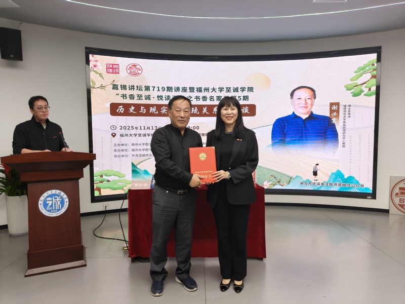 讲座现场,福州大学图书馆馆长林林为谢必震教授颁发嘉锡讲坛荣誉证书,院党委常务副书记何小红为其颁发“书香至诚·悦读汇”之“书香名家汇”主讲嘉宾证书。