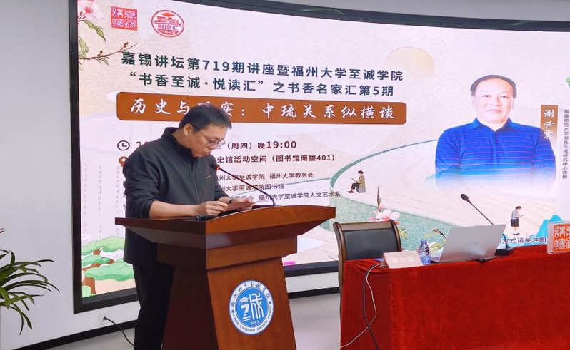 11月13日晚,福州大学图书馆嘉锡讲坛第719期暨福州大学至诚学院“书香至诚·悦读汇”之“书香名家汇”第5期在学院校史馆活动空间成功举办。特邀福建师范大学闽台区域研究中心教授、博士生导师谢必震,以《历史与现实:中琉关系纵横谈》为题,为学院师生带来一场史料翔实、脉络清晰的历史文化讲座。福州大学图书馆馆长林林、副馆长安结,福州大学至诚学院党委常务副书记何小红出席讲座,学院相关部门负责人、部分师生代表聆听了讲座。讲座由院长助理苏童主持。