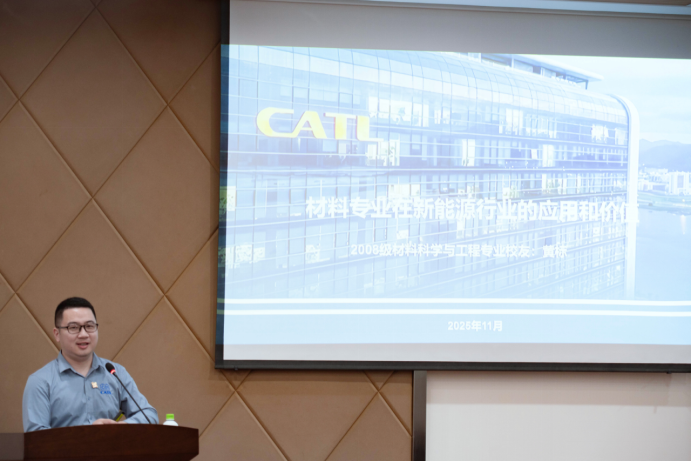 在核心分享环节,福州大学至诚学院校友、宁德时代新能源公司电芯工艺工程部电芯工艺开发经理黄标,结合自身在新能源材料领域的多年实践经验,系统剖析了行业发展现状、未来趋势及核心技术突破点,并分享了个人职业成长历程中的宝贵心得。其内容详实、见解深刻的分享,引发了在场师生的强烈共鸣与热烈讨论。
