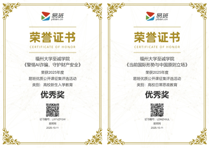 优质公开课启智润心,两部作品跻身全国50强。在2025年度易班优质公开课征集评选活动中,全国高校踊跃参与,竞争激烈,最终仅评选出50部获奖课程。福州大学至诚学院凭借精准的课程定位、扎实的内容架构与生动的呈现形式,成功实现突破,共有2部作品入选,获评“优秀奖”:由马克思主义学院叶钦老师主讲的课程《当前国际形势与中国原则立场》聚焦高校日常思政教育核心需求,以清晰的逻辑、鲜活的案例引导学生树立正确的国际观与家国情怀,助力青年学子坚定理想信念;由辅导员谢水旺老师主讲的课程《警惕AI诈骗,守护财产安全》深耕新生入学教育关键场景,结合当下高发诈骗案例,系统讲解防范技巧,为新生快速适应校园生活、筑牢财产安全防护墙提供了实用指导。两门课程从众多参赛作品中脱颖而出,跻身全国50部优质公开课行列,是学院集体教研实力、教师专业素养与思政育人的生动体现。