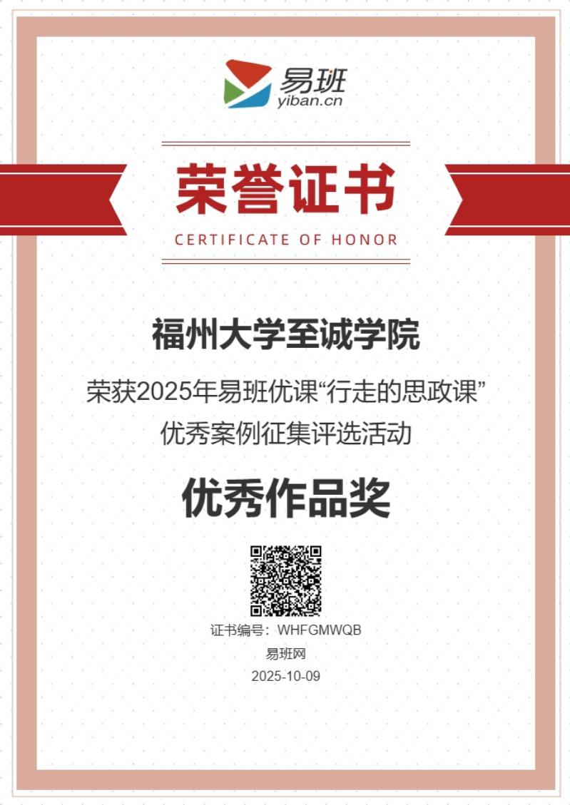 思政教育创新实践,一项案例入选全国十佳。在2025年易班优课“行走的思政课”优秀案例征集评选活动中,全国高校积极报送实践案例,经多轮严格评审,最终仅10部作品获评“优秀作品奖”。福州大学至诚学院报送的案例凭借新颖的实践形式、深刻的思政内涵与显著的育人成效,成功入选并位列第4名,充分展现了学院思政教育实践的创新活力与丰硕成果,为高校思政教育生活化、实践化提供了有益借鉴。