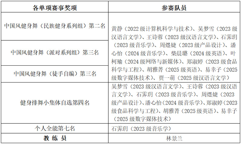 近日,“第19届中国大学生健康活力大赛”在南平市浦城县圆满帷幕。福州大学至诚学院学生啦啦操队在林景兰老师的精心指导下,一举斩获中国风健身舞单项赛第二名1项、第三名2项,健身排舞第四名1项。同时,石霁玥同学还获得个人全能第七名。学院林景兰老师荣获“中国风健身舞优秀教练员”称号。