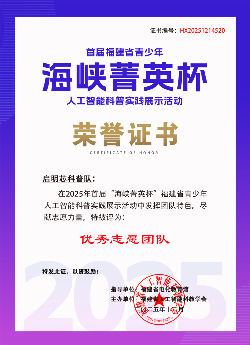 12月14日,首届“海峡菁英杯”福建省青少年人工智能科普实践展示活动在福州第八中学圆满举行。福州大学至诚学院信息工程系“启明芯”科普队受组委会邀请,全程参与赛事志愿服务工作,以专业、高效的服务有力保障了活动顺利开展,展现出新时代青年“奉献回馈社会”的使命担当,获得主办方、参赛选手及家长的广泛好评。