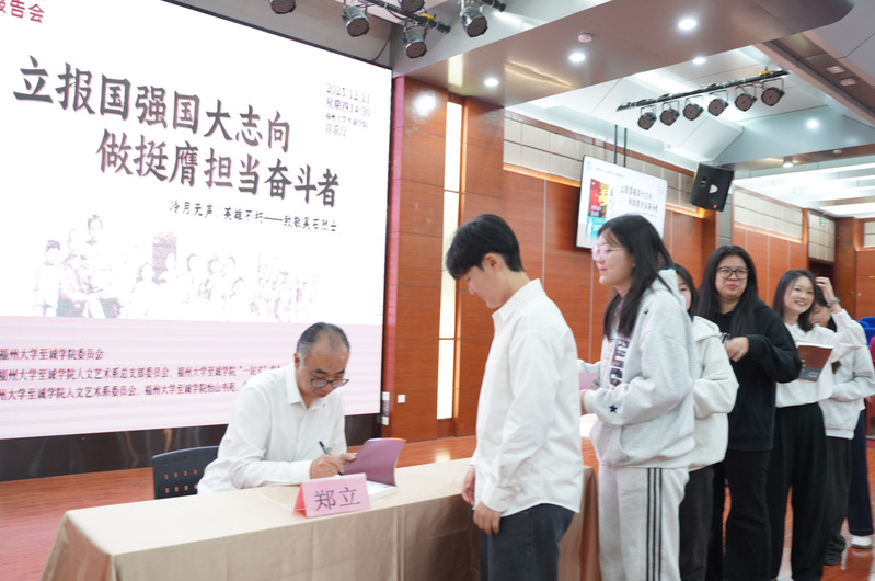现场签名环节,师生们排起长队。“追完剧再听郑老师的讲座,很多剧情里没有的细节,让吴石将军的形象在我心中更立体、更鲜活了。”福州大学至诚学院学生林彦兵难掩激动。学生赖子馨表示:“获得这本书对自己而言更是一种精神指引,这让我更加坚定了去西部支教的决心,要像吴石将军一样,为祖国的事业奉献青春力量。”