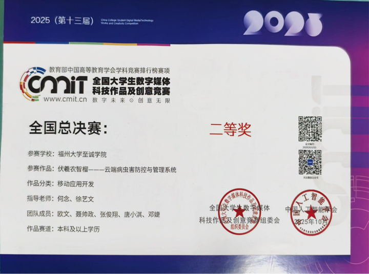 近日,第十三届全国大学生数字媒体科技作品及创意竞赛全国总决赛在哈尔滨工业大学圆满落幕。福州大学至诚学院信息工程系学子凭借扎实的技术功底与突出的创意表现,在与清华大学、浙江大学、北京理工大学等众多985、211高校团队的同台竞技中脱颖而出,斩获国家级二等奖1项;三等奖2项。